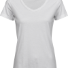 Hochwertiges Single-Jersey-T-Shirt mit tiefem V-Ausschnitt. Hergestellt aus hochwertiger, langfaseriger Bio-Baumwolle und mit einer einzigartigen, taillierten Passform. Es ist an Schulter und Ärmeln leicht tailliert und hat einen lockereren Körper.
